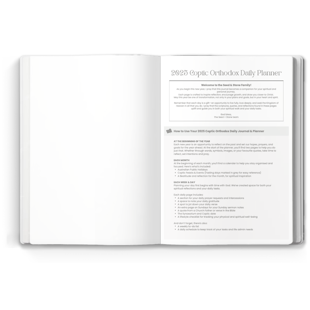 Designed with love and care, the 2025 Coptic Orthodox Daily Journal & Planner is the perfect tool for those looking to blend their faith with everyday life. Embrace the journey, and let this planner guide you through the year ahead!